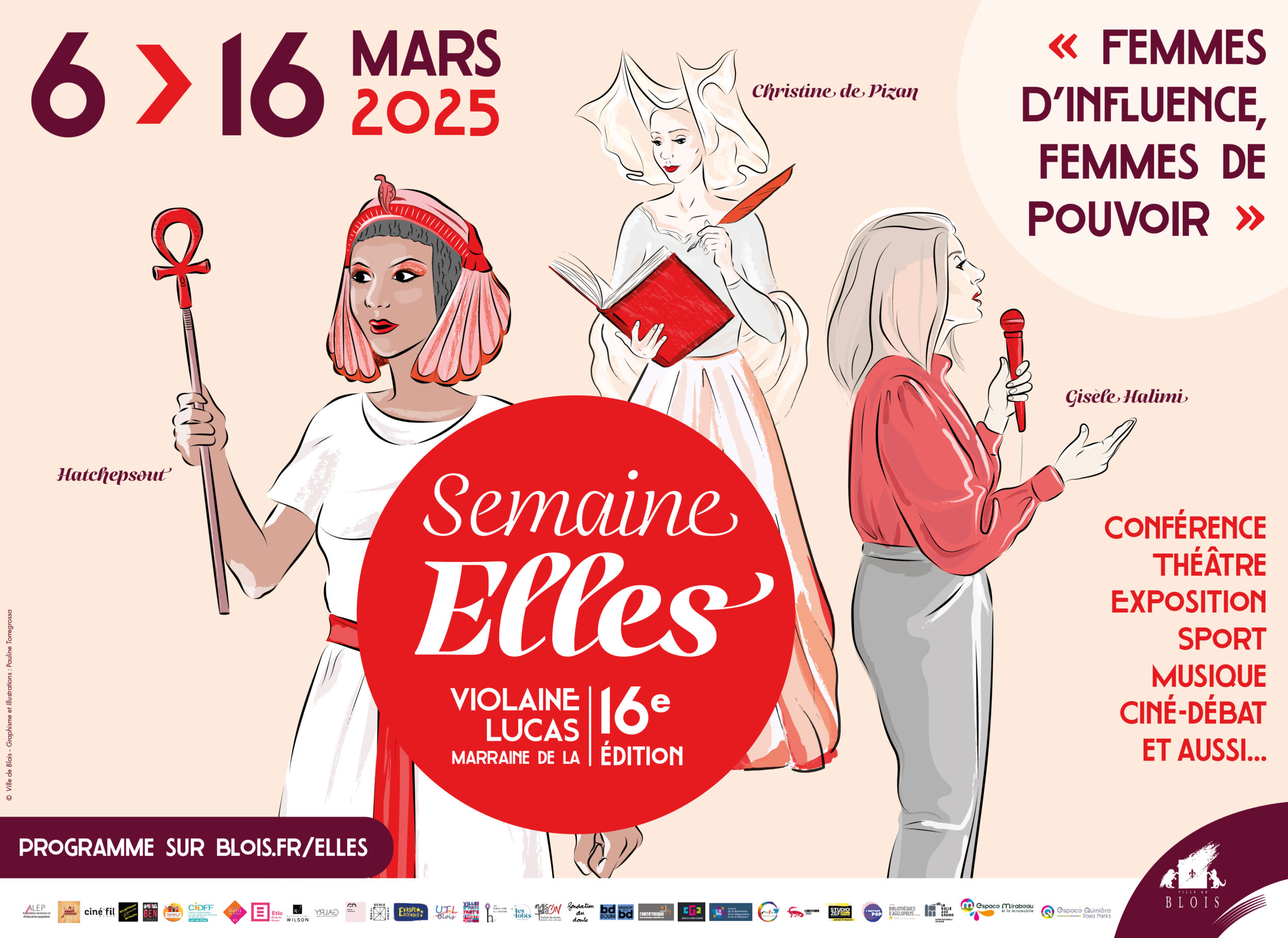 Illustration et mise en page des affiches de la Semaine Elles 2025, temps fort organisé chaque année par la Ville de Blois pour prolonger la journée internationale des Droits des femmes – 2025